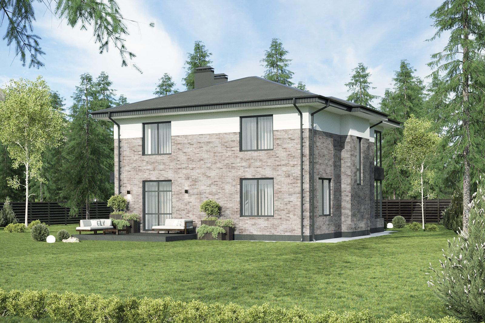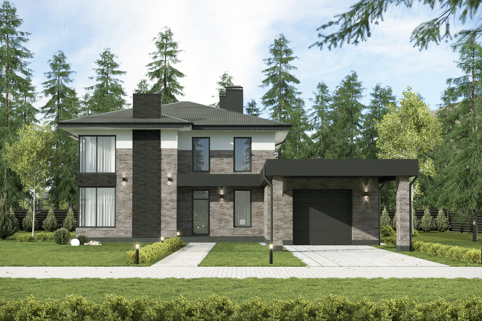Современный коттедж в классическом стиле. Этот просторный двухэтажный загородный дом — идеальное место для большой семьи. Здесь есть всё необходимое для комфортной жизни: уютные комнаты, высокие потолки, большие панорамные окна. Преимуществом этого дома является рациональное использование внутренних пространств, стильные угловые окна, а также гараж и навес для двух автомобилей.